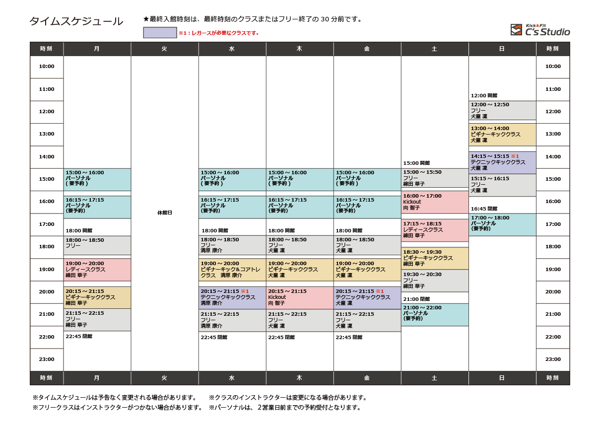タイムスケジュールに記載されているクラス内容、料金・利用回数、スタッフについては下記リンクからご確認いただけます。